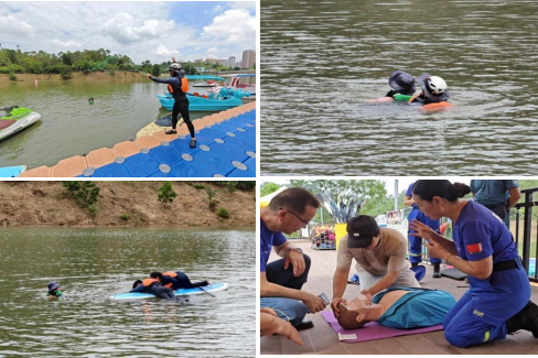 8月22日上午9時(shí),桃花源游客服務(wù)中心聯(lián)合惠州市藍(lán)天救援隊(duì)、惠州市槳板運(yùn)動(dòng)協(xié)會(huì)在桃花源水上運(yùn)動(dòng)中心開(kāi)展“防溺水專(zhuān)項(xiàng)應(yīng)急演練”。此次演練統(tǒng)籌組織了景區(qū)保安、水上項(xiàng)目全體員工、經(jīng)營(yíng)業(yè)態(tài)負(fù)責(zé)人等30余人,圍繞“發(fā)現(xiàn)—呼救—救援—醫(yī)療”全鏈條開(kāi)展實(shí)戰(zhàn)化水上安全救援演練。